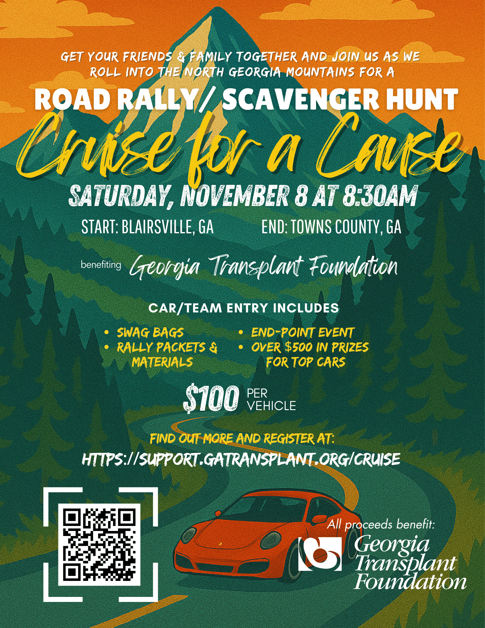 Get your friends & family together and join us as we roll into the north Georgia mountains for a road rally scavenger hunt, benefiting the Georgia Transplant Foundation.